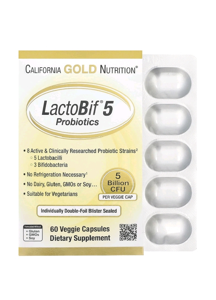 احصل على دعم يومي متوازن لصحة الجهاز الهضمي مع California Gold Nutrition LactoBif® 5، تركيبة متطورة تحتوي على 8 سلالات بروبيوتيك نشطة بتركيز 5 مليارات وحدة تشكيل مستعمرة (CFU) لكل كبسولة نباتية. يساعد هذا المكمل الغذائي على تعزيز توازن البكتيريا النافعة في الأمعاء، مما يدعم الهضم الصحي ويقوي جهاز المناعة.